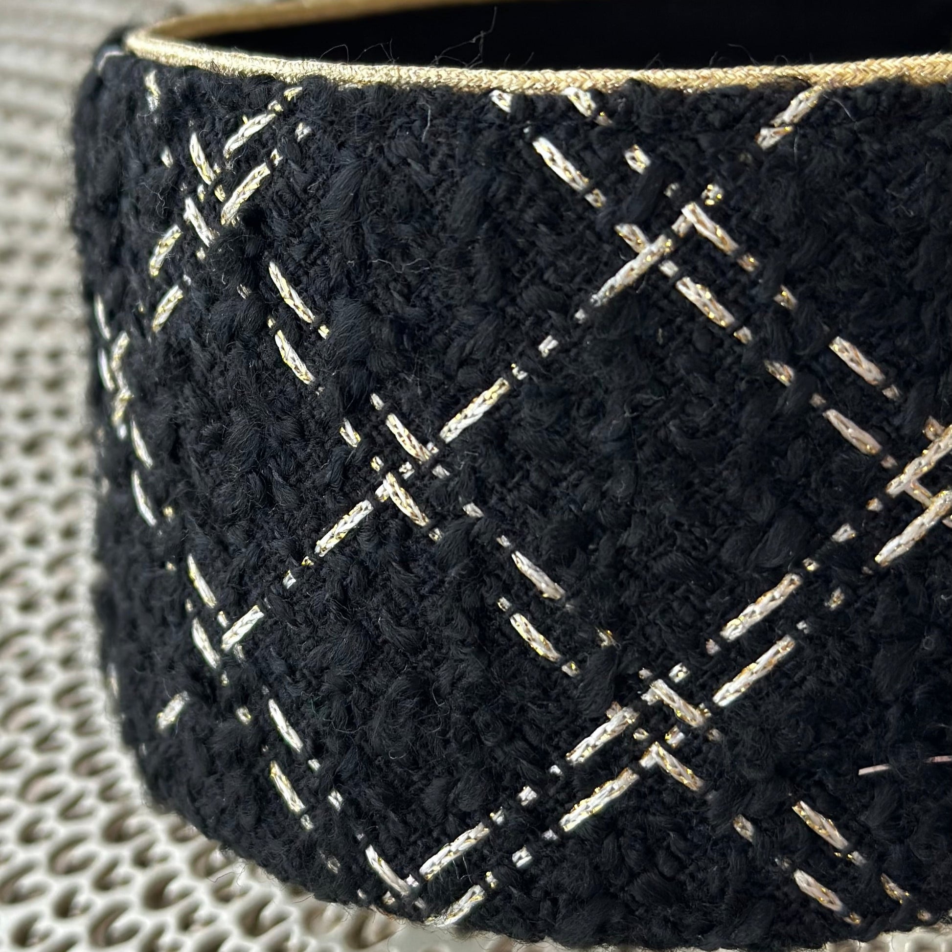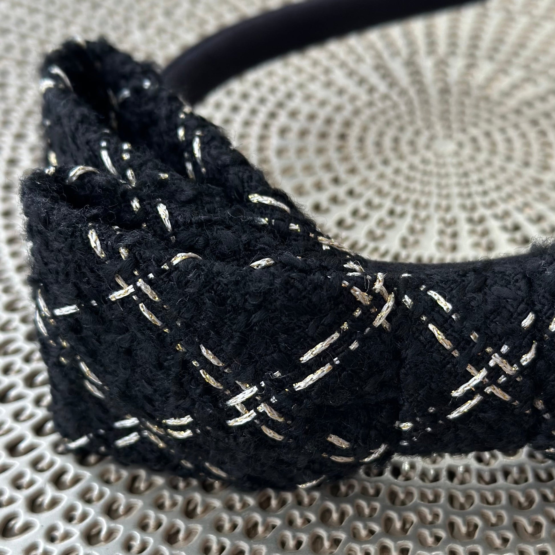 漆黒のツイード生地に繊細に施されたシャンパンゴールドのステッチ、同色のパイピングが上品な輝きを放ちます。クラシックでありながら現代的、大胆でありながら繊細という対照的な美学が見事に融合したこのカチューシャは、どんなスタイリングにも調和し、装う人の個性を引き立てます。