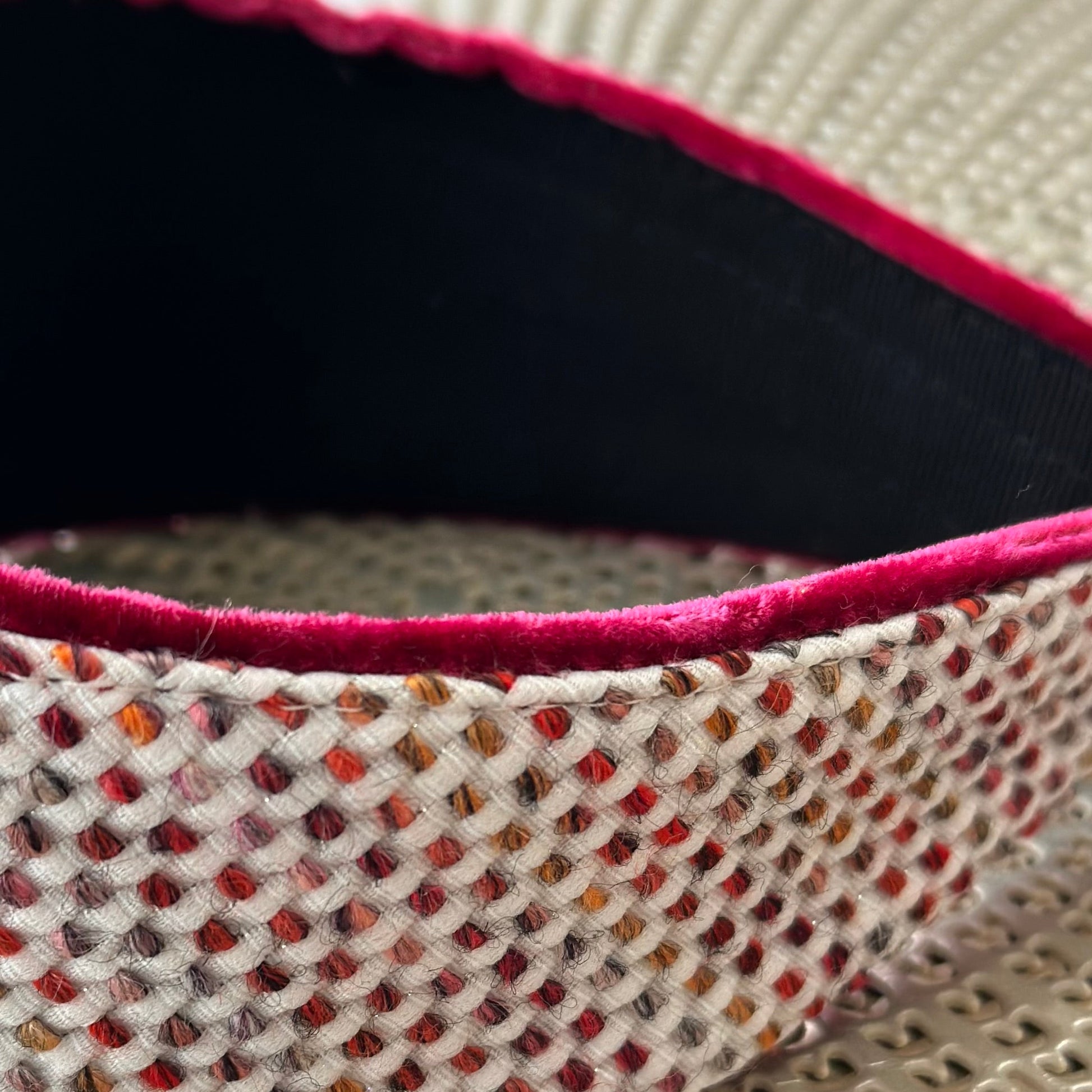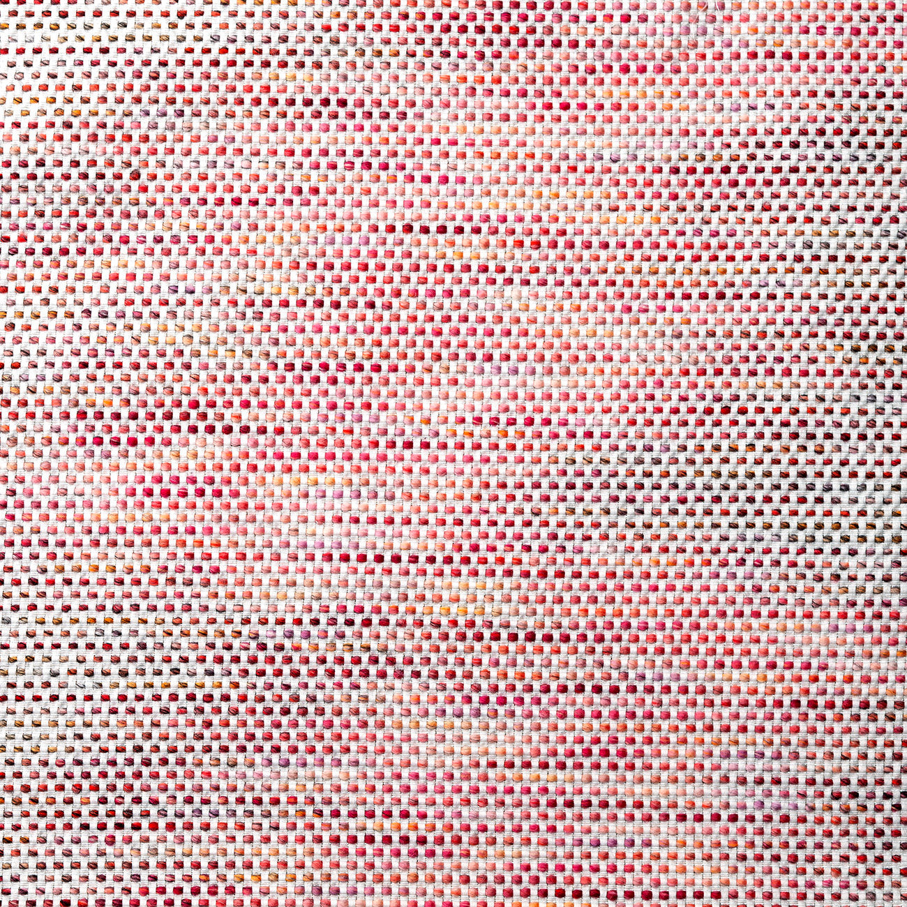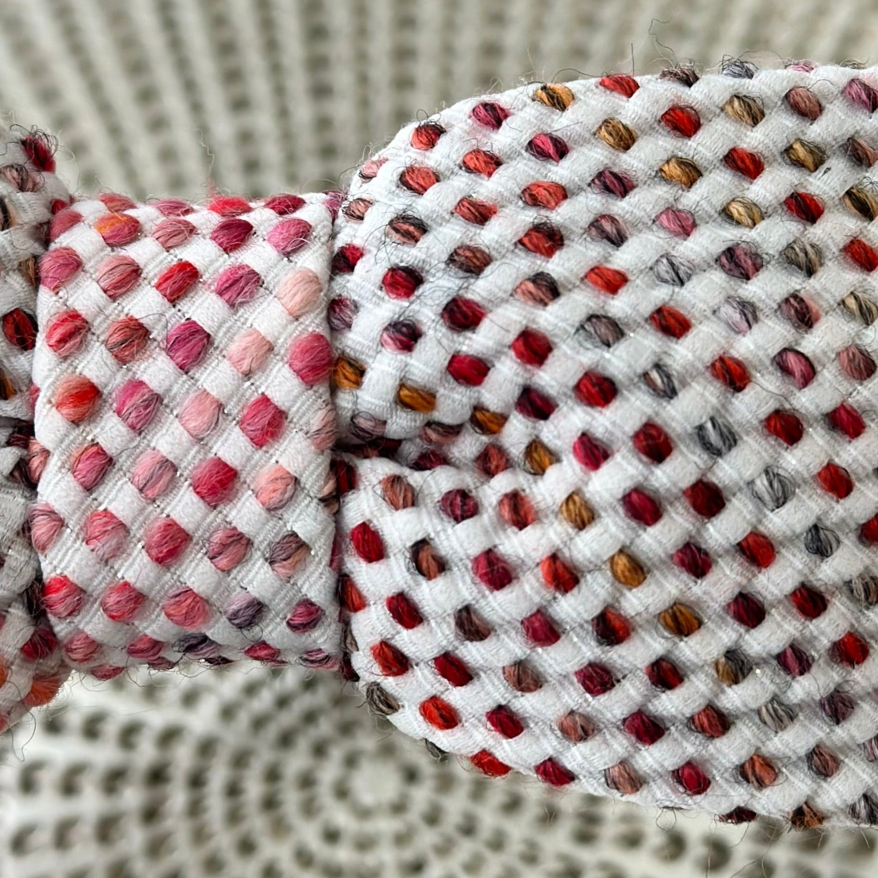 オレンジ・ピンク・赤・紫・グレーと複雑なグラデーションが、ダイヤモンドダストを含んだような白地の中を、クロスステッチ状に展開します。白の抜け感で暑さの残る時期から秋色を取り込めますし、ダークに沈みがちな秋コーデを明るく出来、また、爽やかさと温かみが対決してしまいがちなまっ白の服と秋色の服を馴染ませるにも便利です。色の出方に個別差があるので、店頭で見比べてのお買い物をお勧めします。