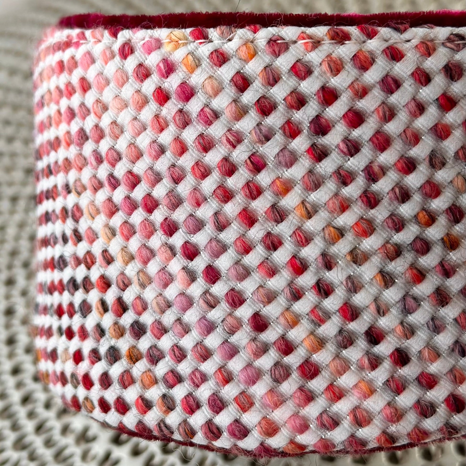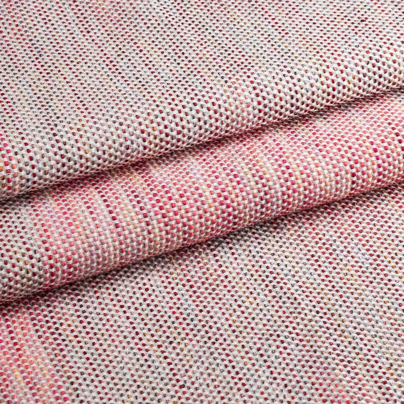 特筆すべきは、この布地に施された絶妙なグラデーション効果。クリーム色のベースキャンバスに、バーガンディの深い色合いから、情熱的なクリムゾン、ロマンティックなピンク、温もりあるアンバー、そして気品漂うゴールドへと、まるで自然の移ろいを映したような繊細なグラデーションが施されています。