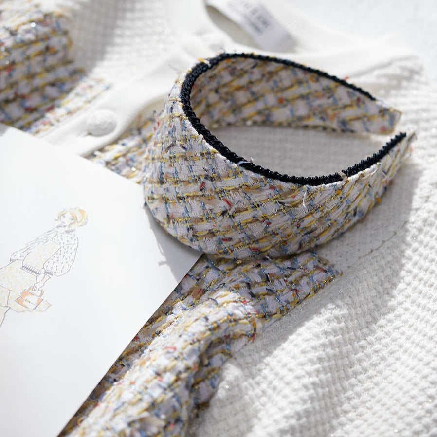 オフホワイトのベースに、イエロー、ベビーブルー、スカイグレーなどのニットヤーンを縦横に行き交わせた早春を思わせる生地は、イギリスのラグジュアリーテキスタイルの名門・LINTON社による別注ツイード。