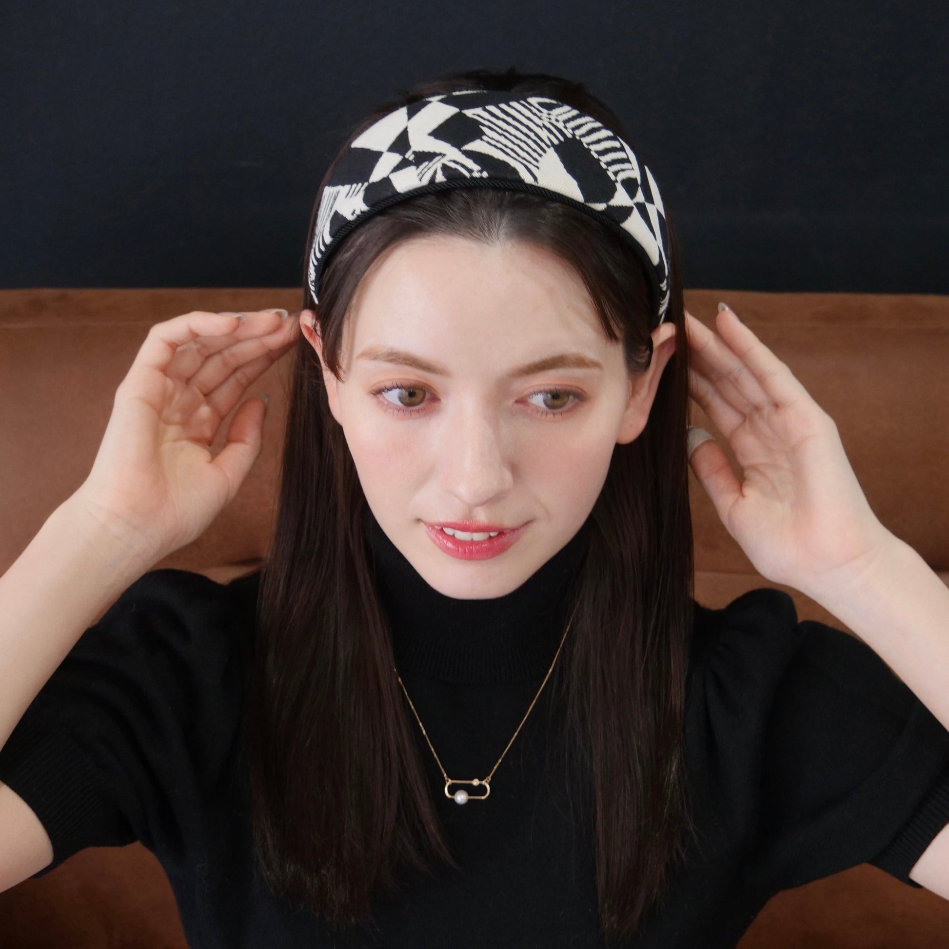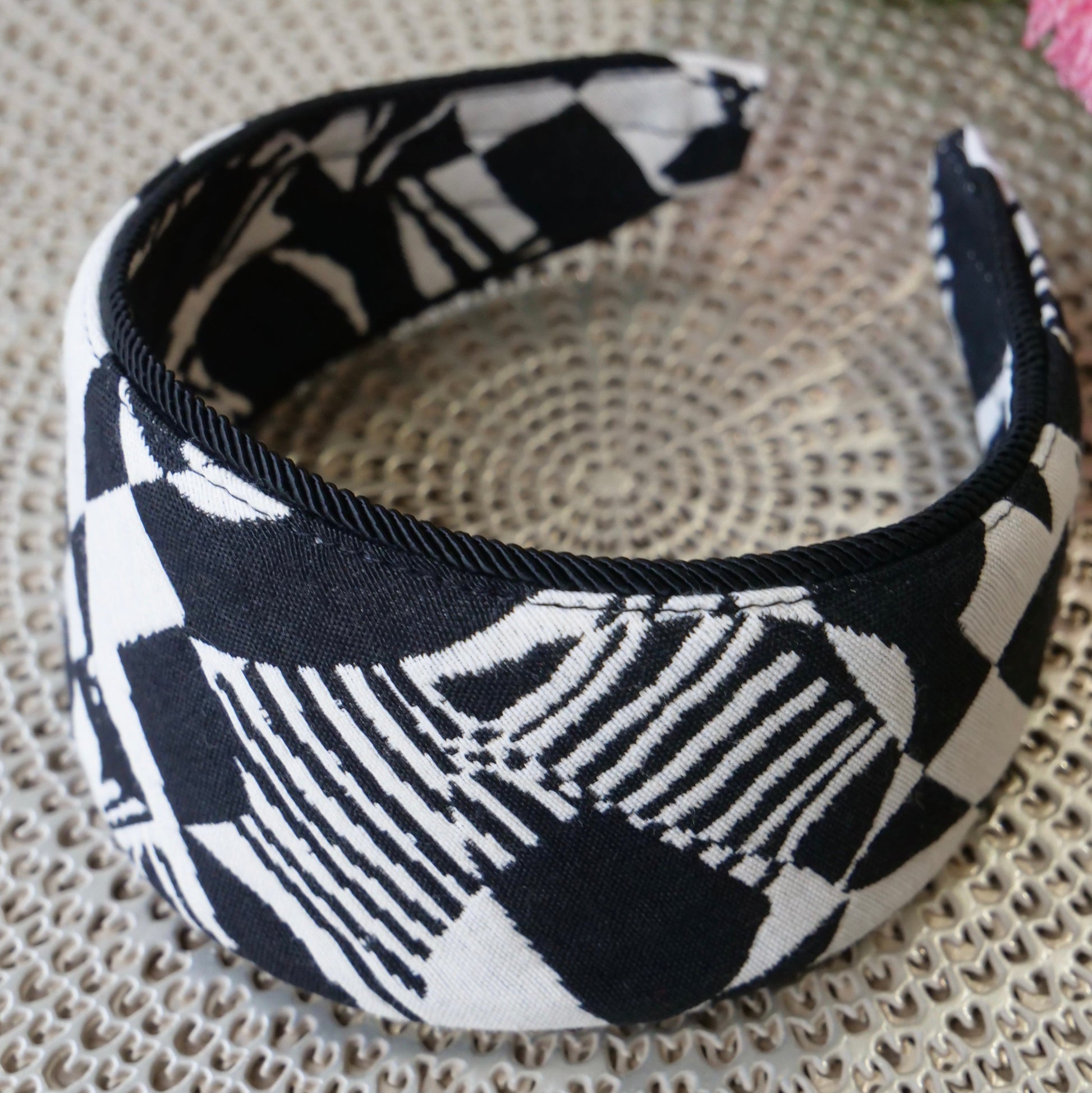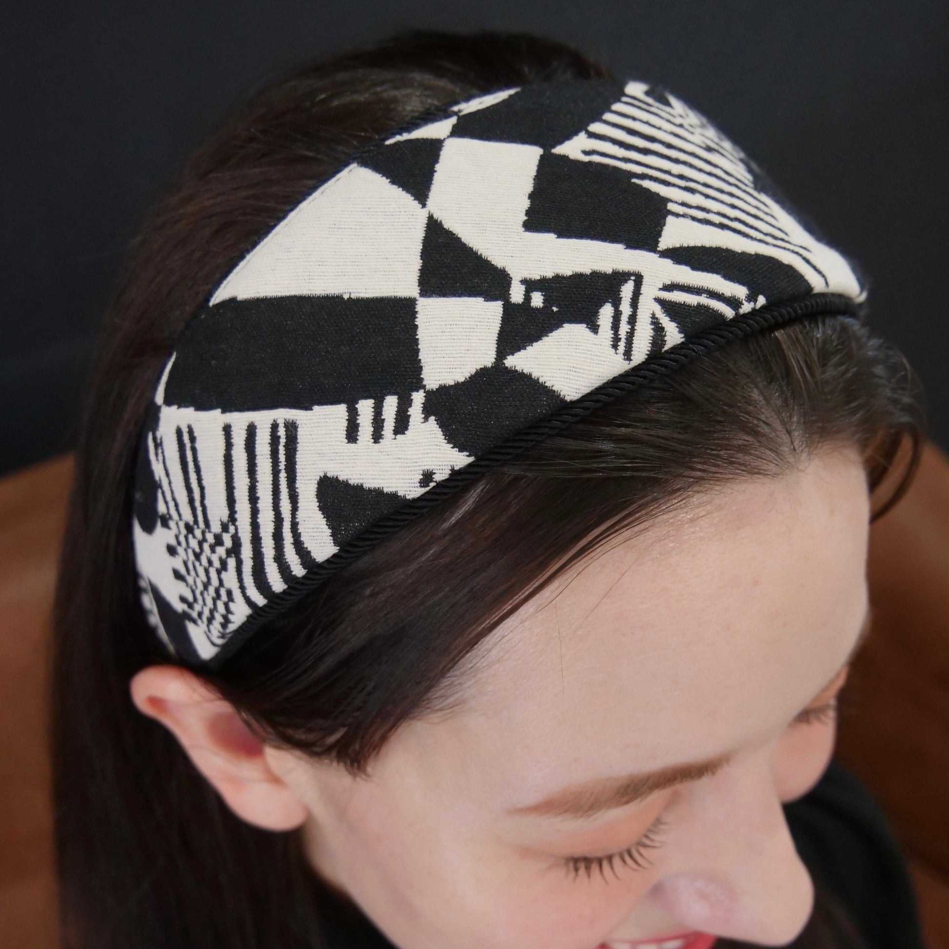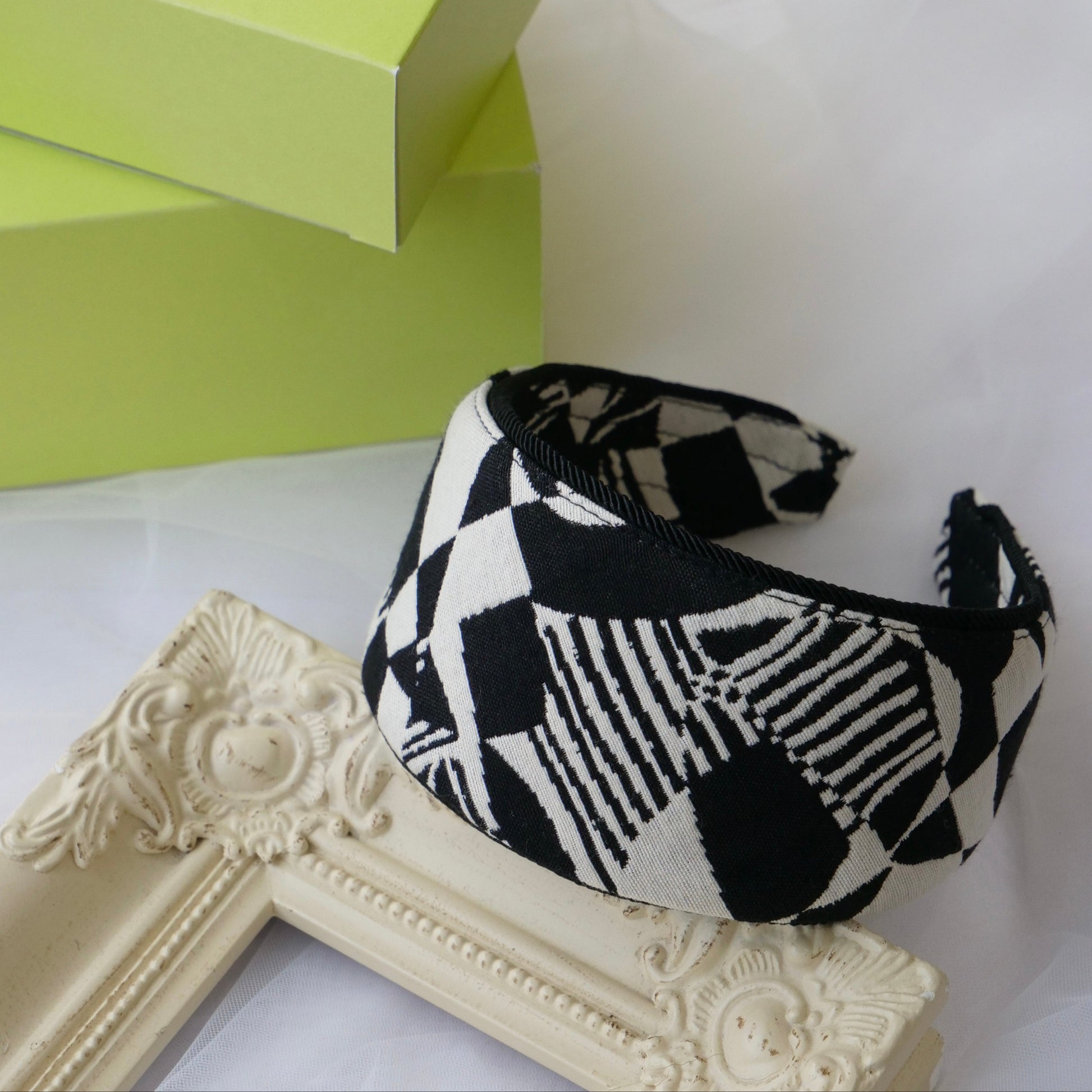 モノクロームの幾何学模様が織りなすグラフィカルなデザインは、チェッカーボード、ストライプ、アブストラクトなパターンが絶妙に組み合わされ、どの角度から見ても新しい表情を発見できる魅力的な一品。まさに「Fragment(断片)」という名前が示すように、様々なデザインエレメントが一つに融合した、唯一無二のカチューシャです。