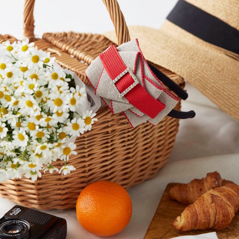 SATAB社の限定品であるlinen100%のリボンをミルフィーユのように重ね上げ、ジュリアンフォール社の織りと色が美しい鮮やかな朱色リボンを組み合わせました。素材感と鮮やかな色合いが夏のコーディネートを格上げする魅力的なカチューシャです。